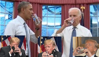 Obama and Biden drinking water, vs sippy cup trump steadying his hand.